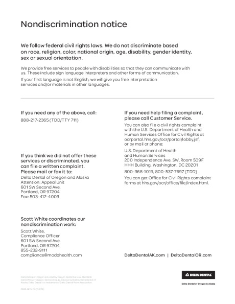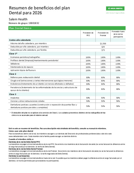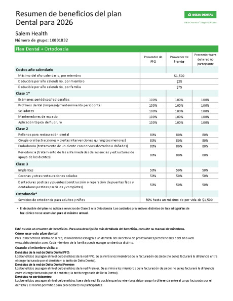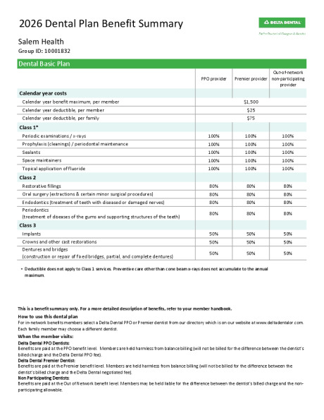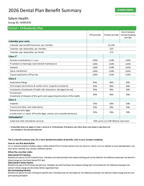 Salem Health offers two Delta Dental plan options โ the Dental Basic plan or the Dental + Orthodontia plan. All family members must be enrolled on the same plan; mixing coverage options within a family is not permitted.