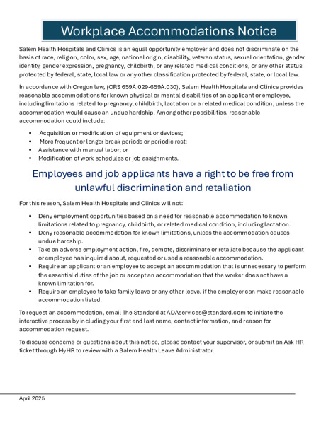 Salem Health will make reasonable accommodations for known physical or mental disabilities of an applicant or employee as well as known limitations related to pregnancy, childbirth or a related medical condition, such as lactation, unless the accommodation would cause an undue hardship. Among other possibilities, reasonable accommodations could include: