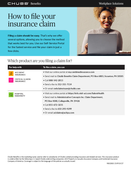 Stay financially protected when accidents happen. Whether it’s a sports injury, slip and fall, or broken bone, this coverage pays cash benefits for ER visits, fractures, x-rays, surgeries, and more. Chubb has customized this plan to pay an increased benefit if you are admitted to the Salem Health hospital or visit a Salem Health emergency room.